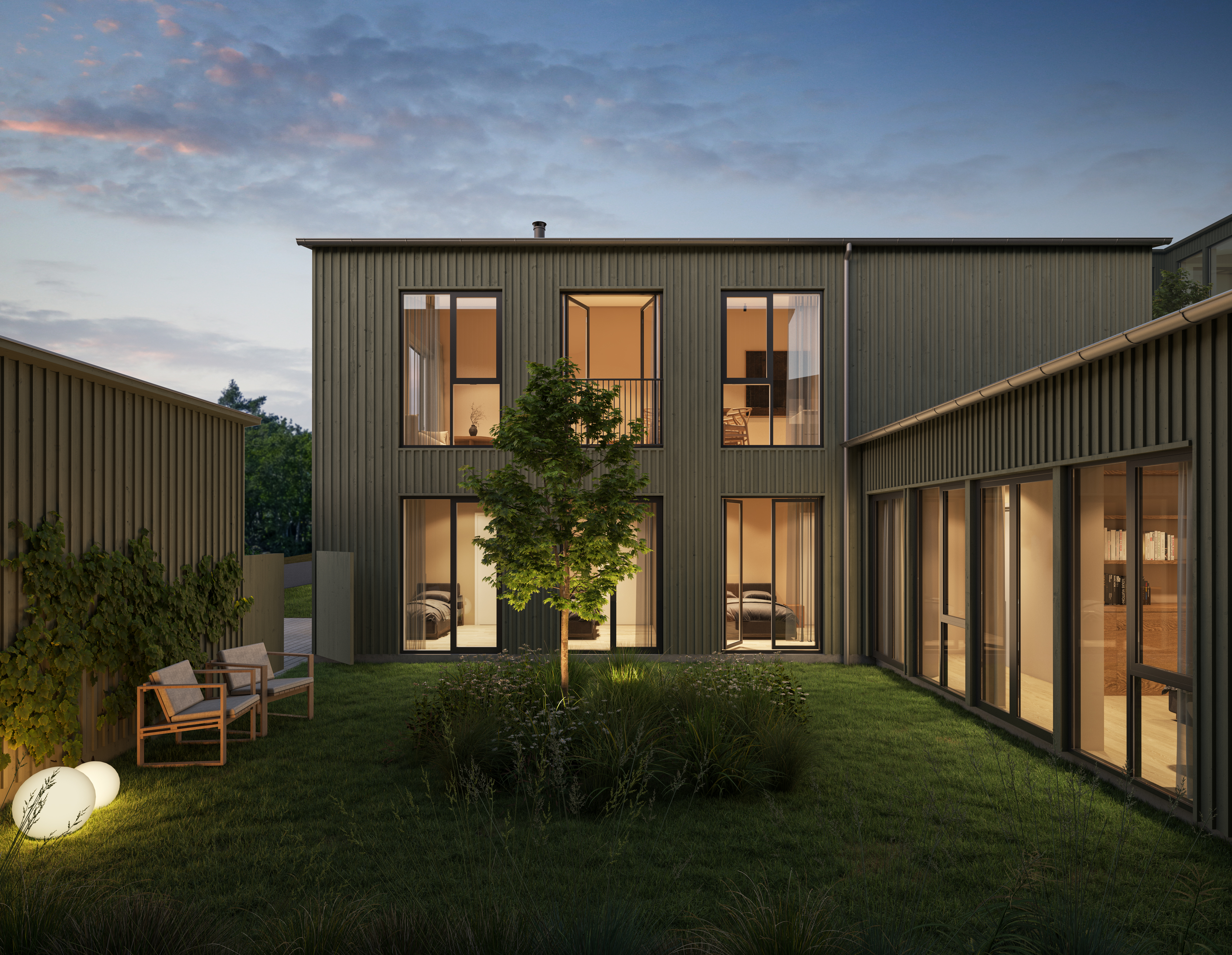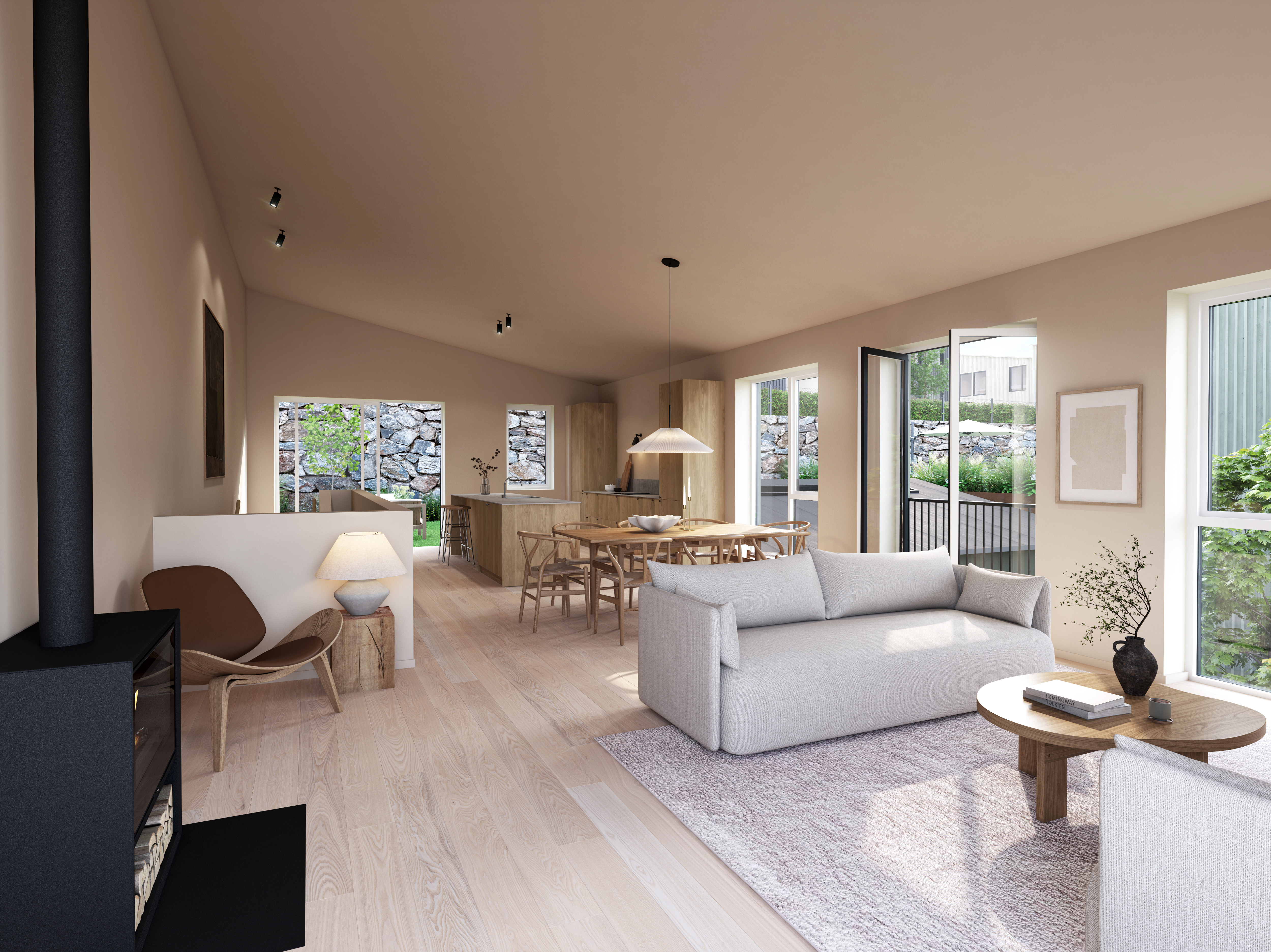 Her får du en romslig planløsning med fire soverom, to bad, eget toalett og praktisk vaskerom. I andre etasje åpner boligen seg opp med stue og kjøkken, med direkte utgang til en skjermet og solrik uteplass på baksiden av huset.